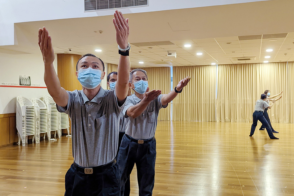 位于岛国北部的中医义诊中心职工,就联同两位西医部职工,趁午休空档练习;而两所幼教中心职工是趁每周五下班后的时段,紧锣密鼓排练。静思堂职工则是每周星期一、三、五,于午休的半小时空档练习。对很多参与过经藏演绎的职工来说,像今天这般反复微调姿势和表情,都是入经藏必经的“化城”。